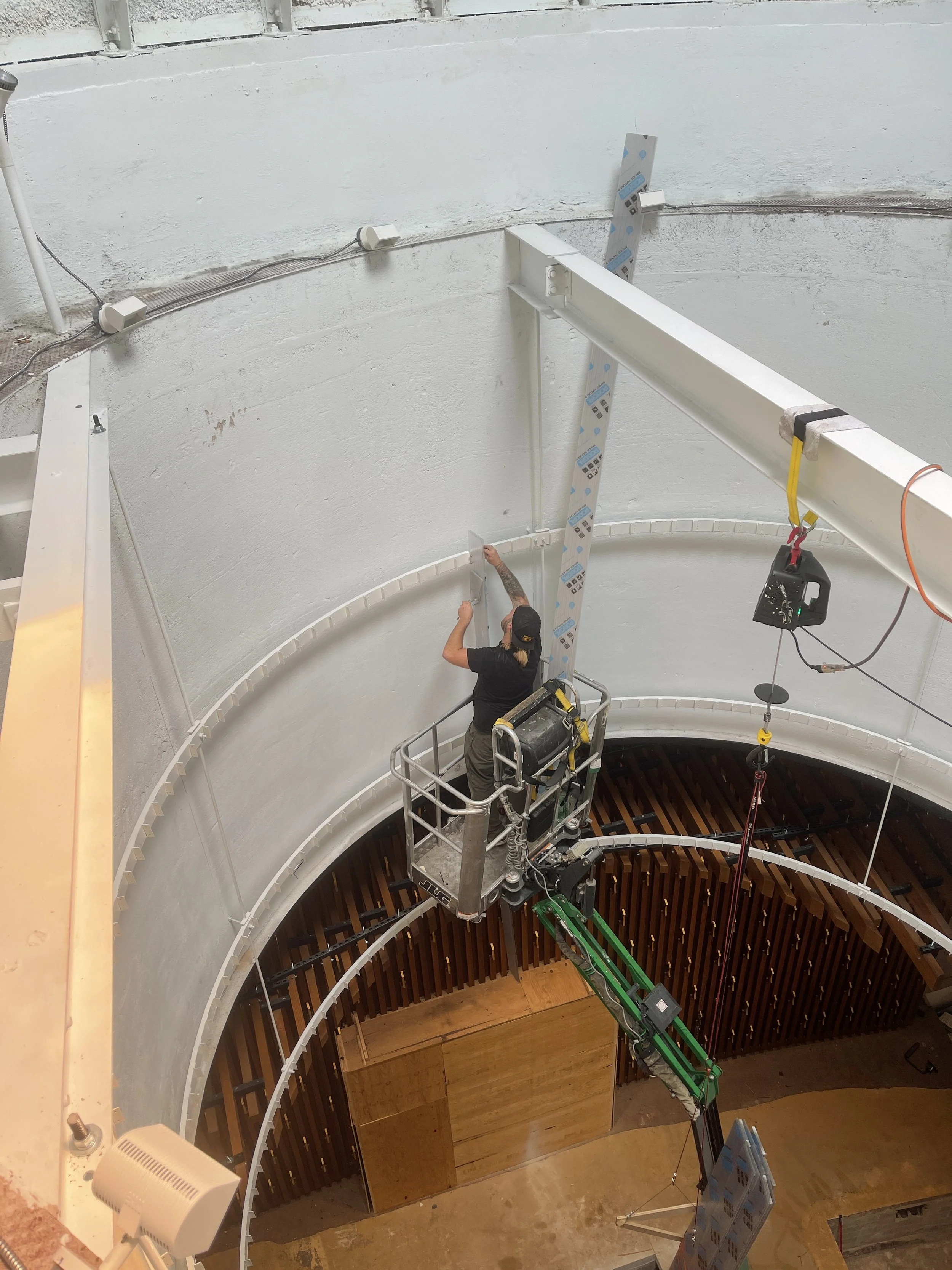 Features 125 acrylic panels and three 20ft steel rings. Designed to draw light down from existing dome in sanctuary.