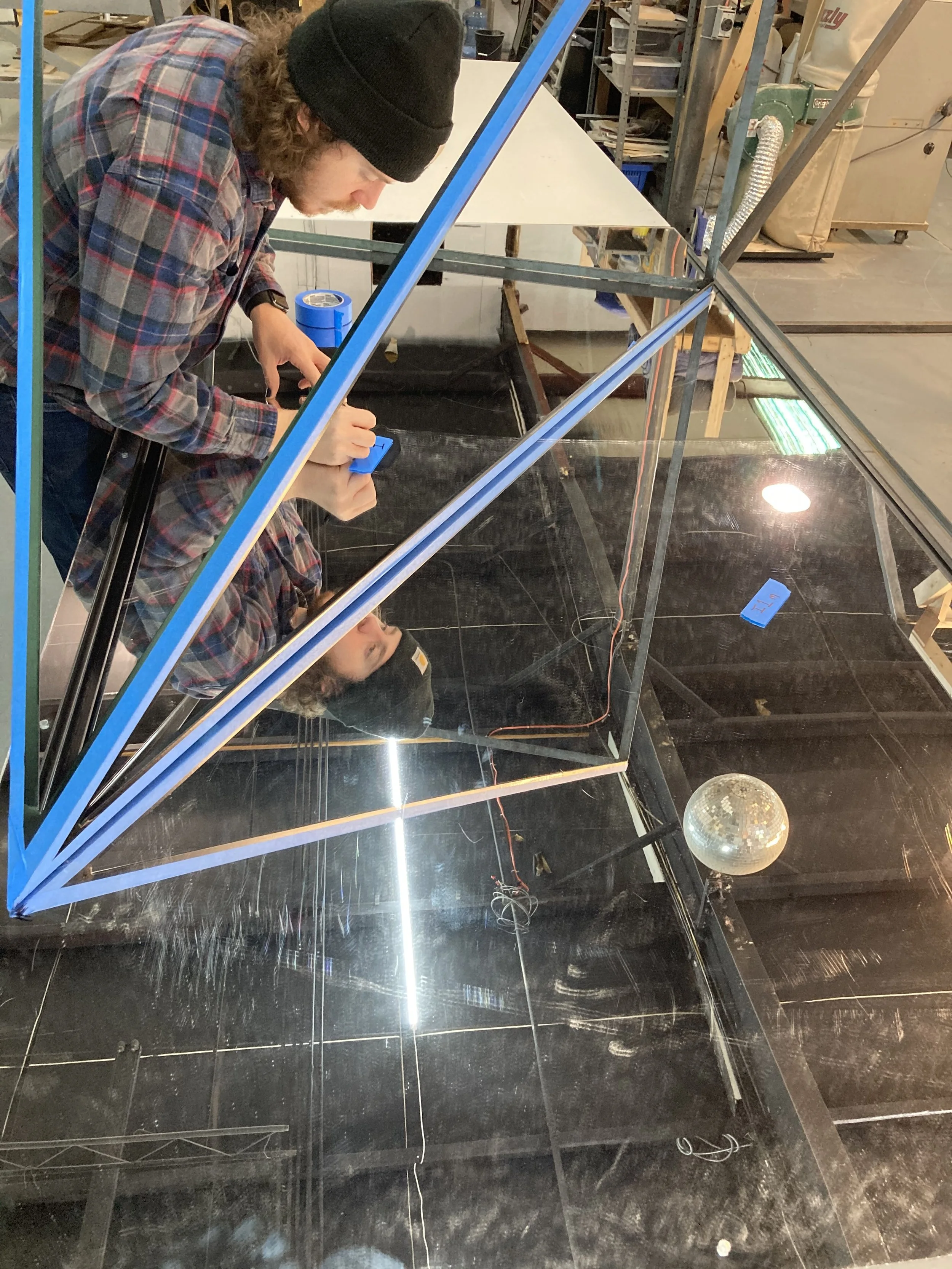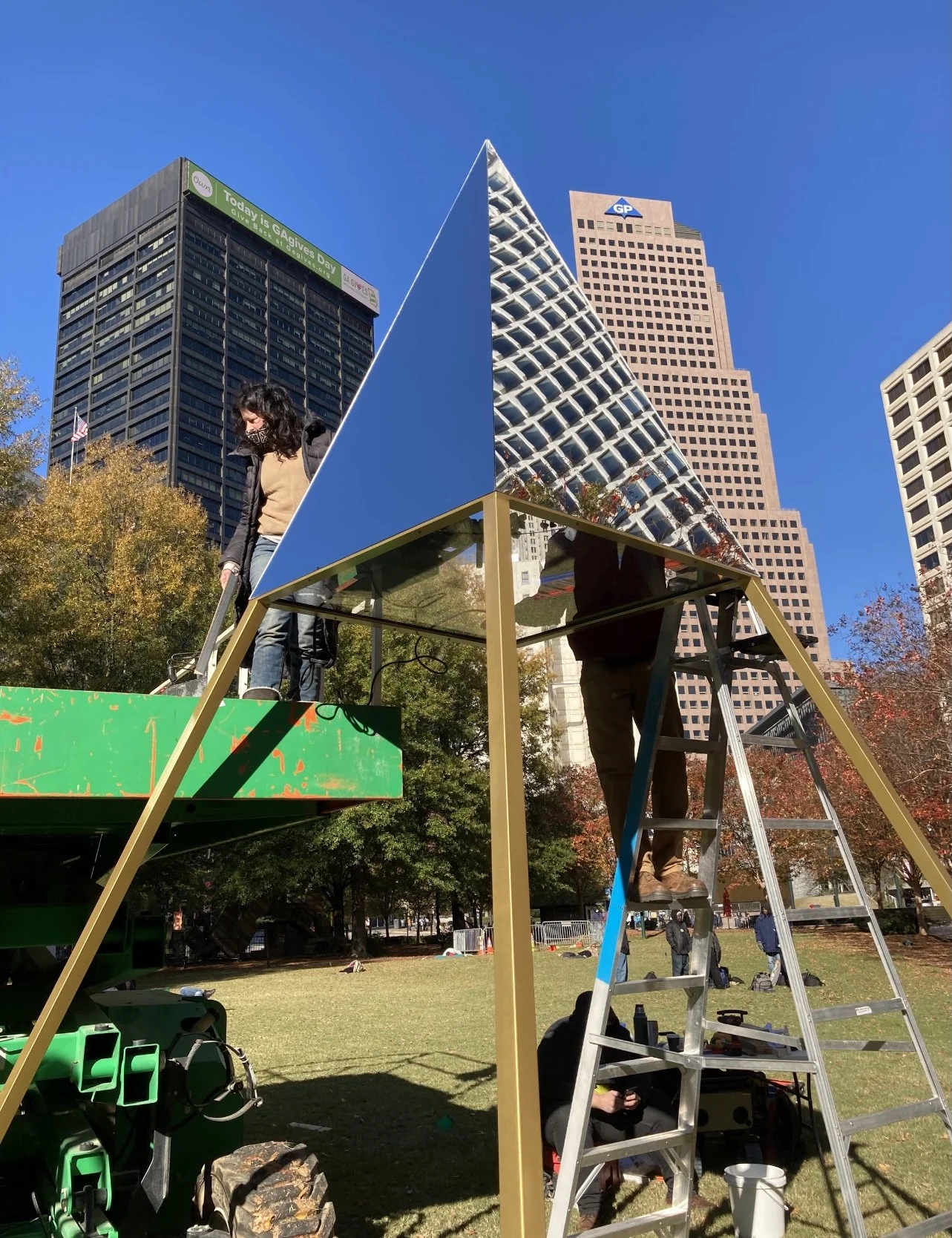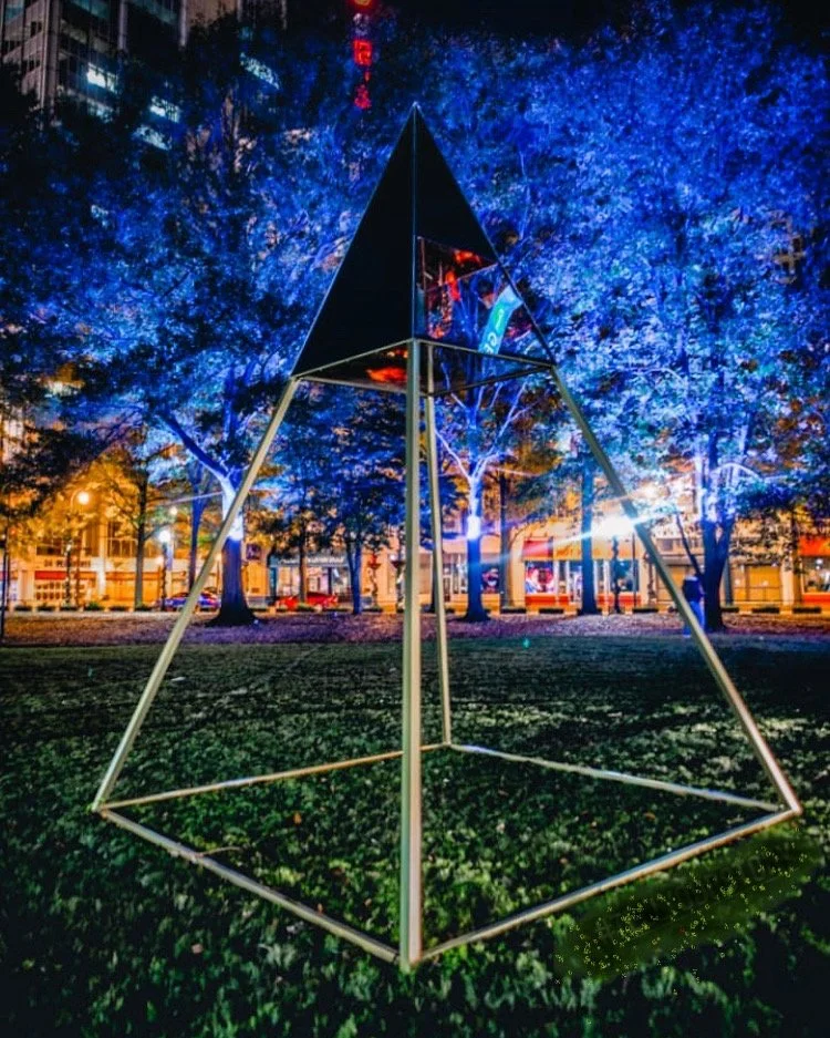 A 16ft steel pyramid crafted from acrylic mirrored panels and welded metal armature, with integrated lighting and effects. Partnered with Dashboard and Madora Frey.