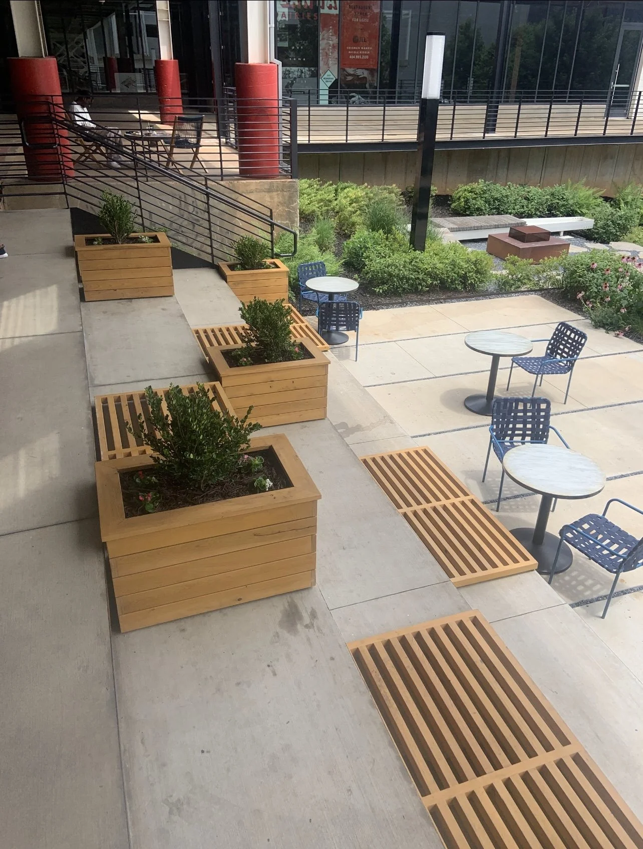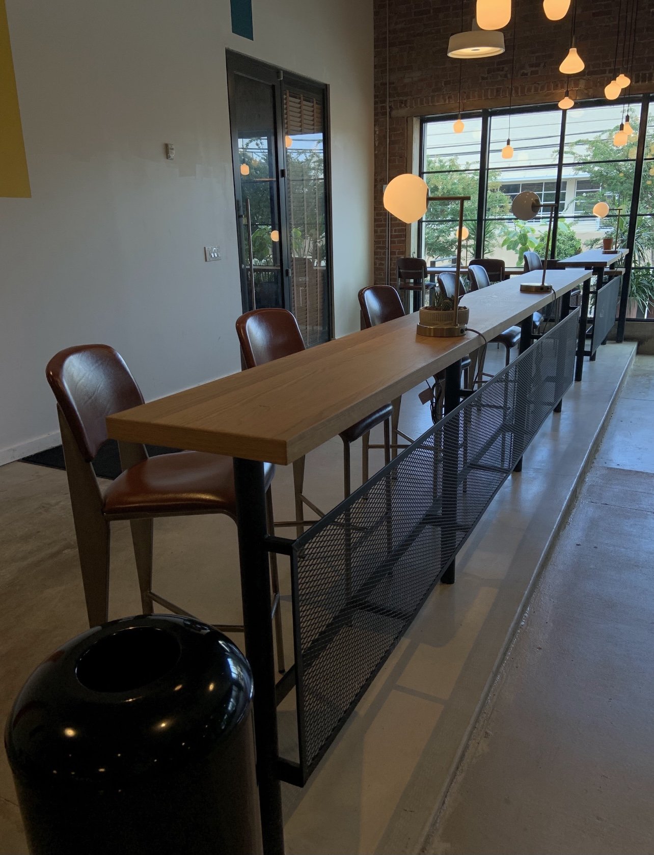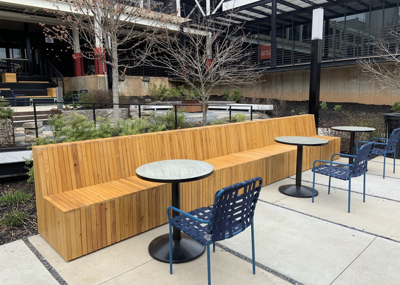 20ft outdoor wooden banquet with welded steel framework. Multiple oak and steel standing bars with integrated electrical charging stations.