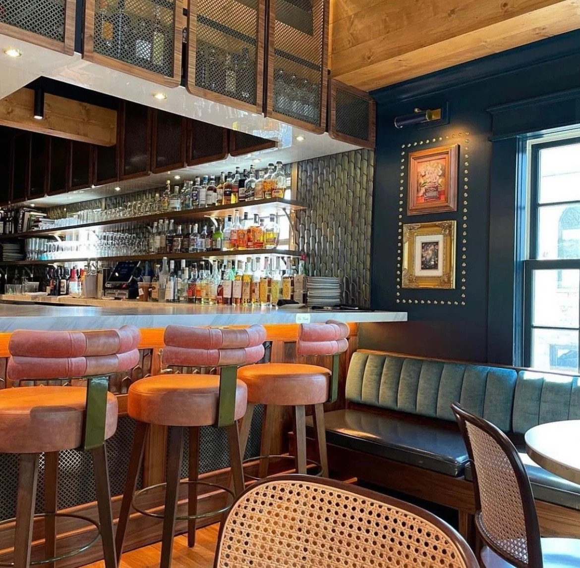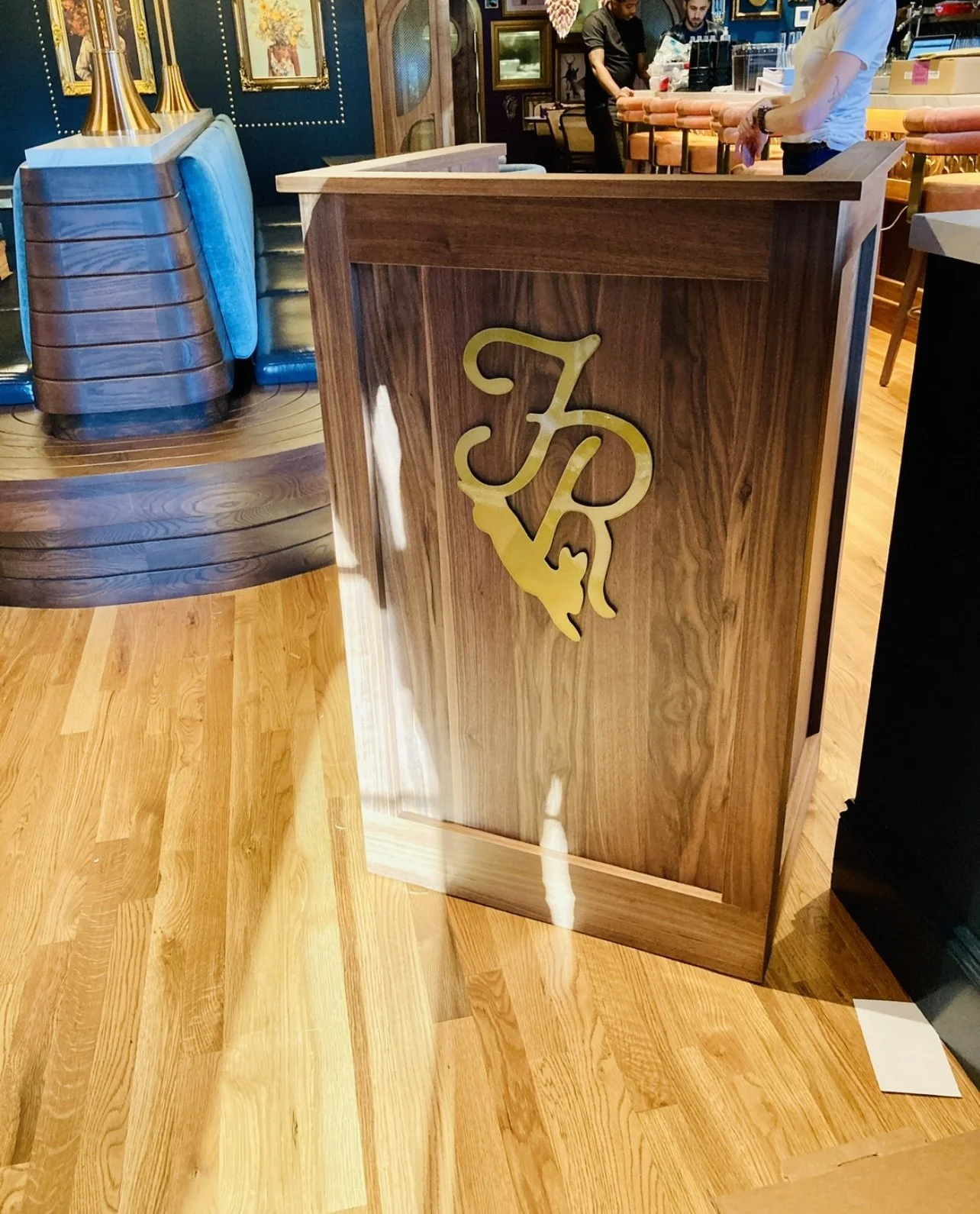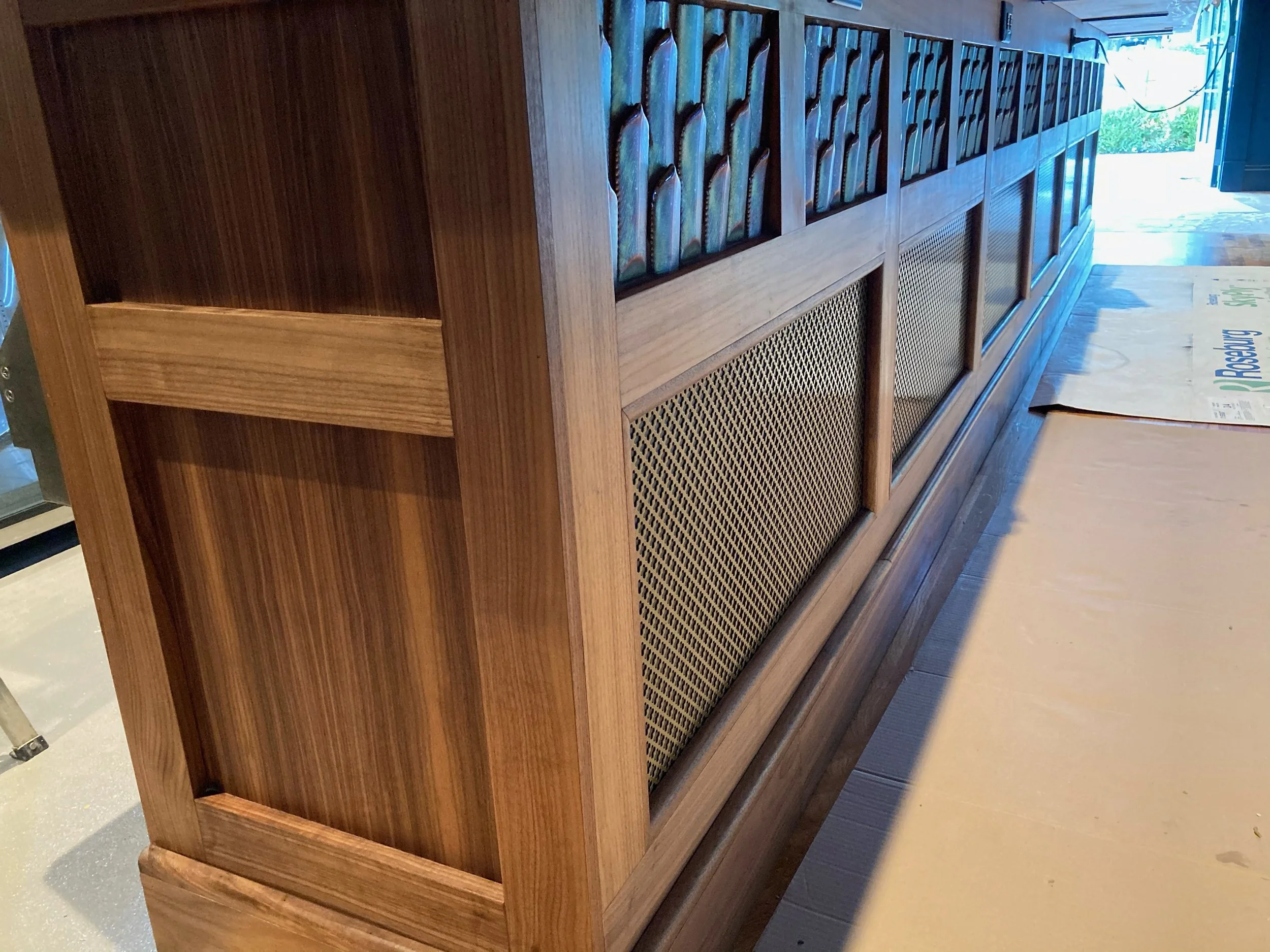 Custom metal fabrication, powder coating application, millwork and furniture. Features outdoor sign, steel overhead bar with wooden handles and perforated metal, hostess stand and bar. Integrated lighting with acrylic soffit.