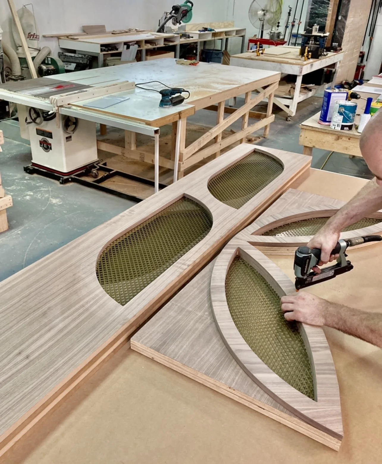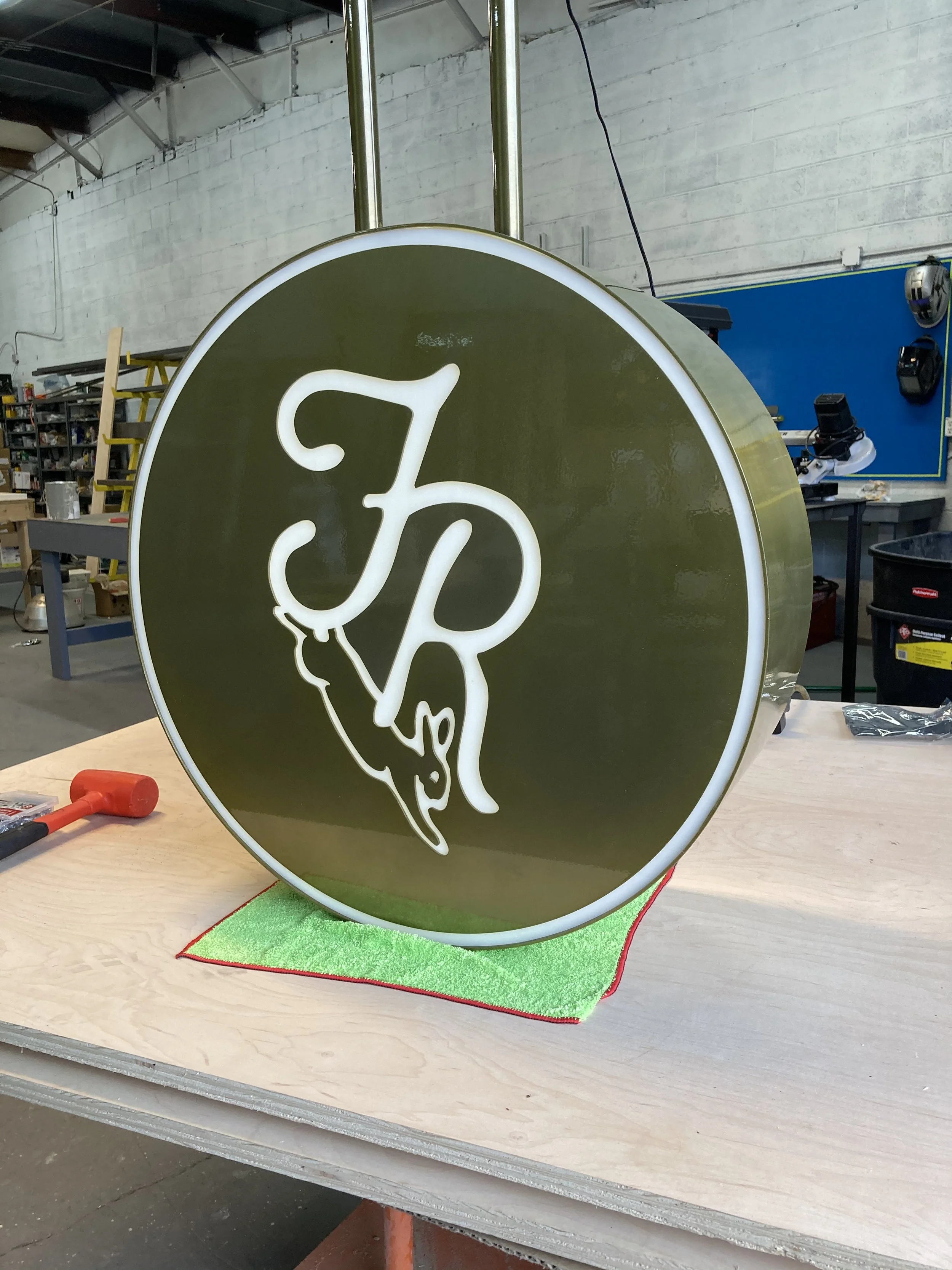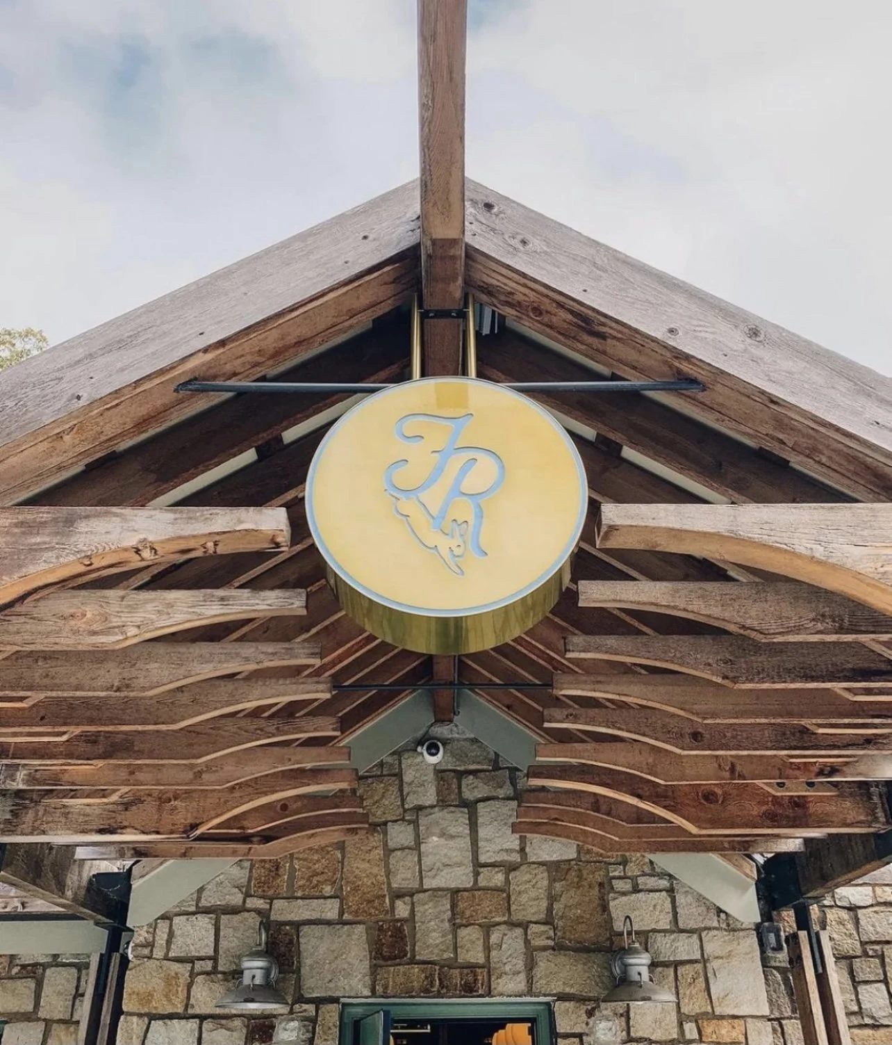 Custom metal fabrication, powder coating application, millwork and furniture. Features outdoor sign, steel overhead bar with wooden handles and perforated metal, hostess stand and bar. Integrated lighting with acrylic soffit.