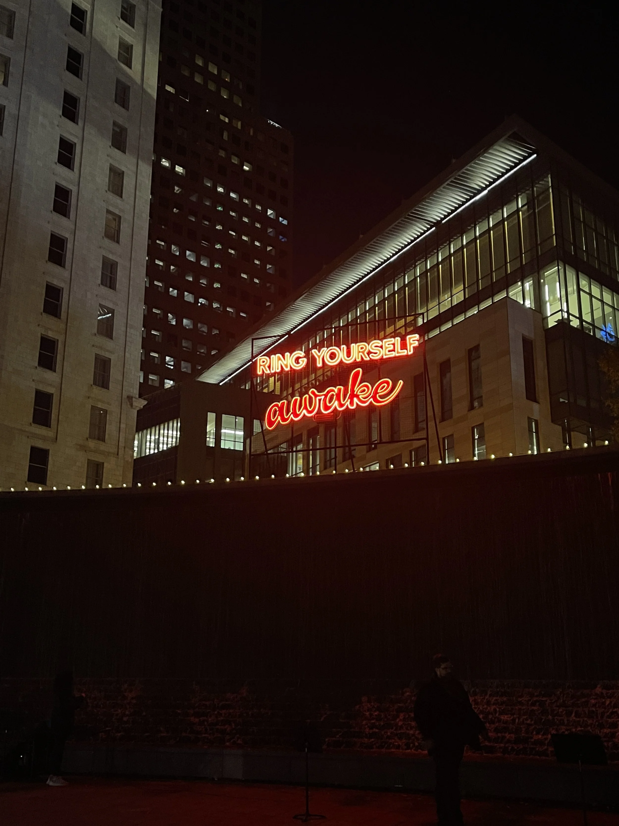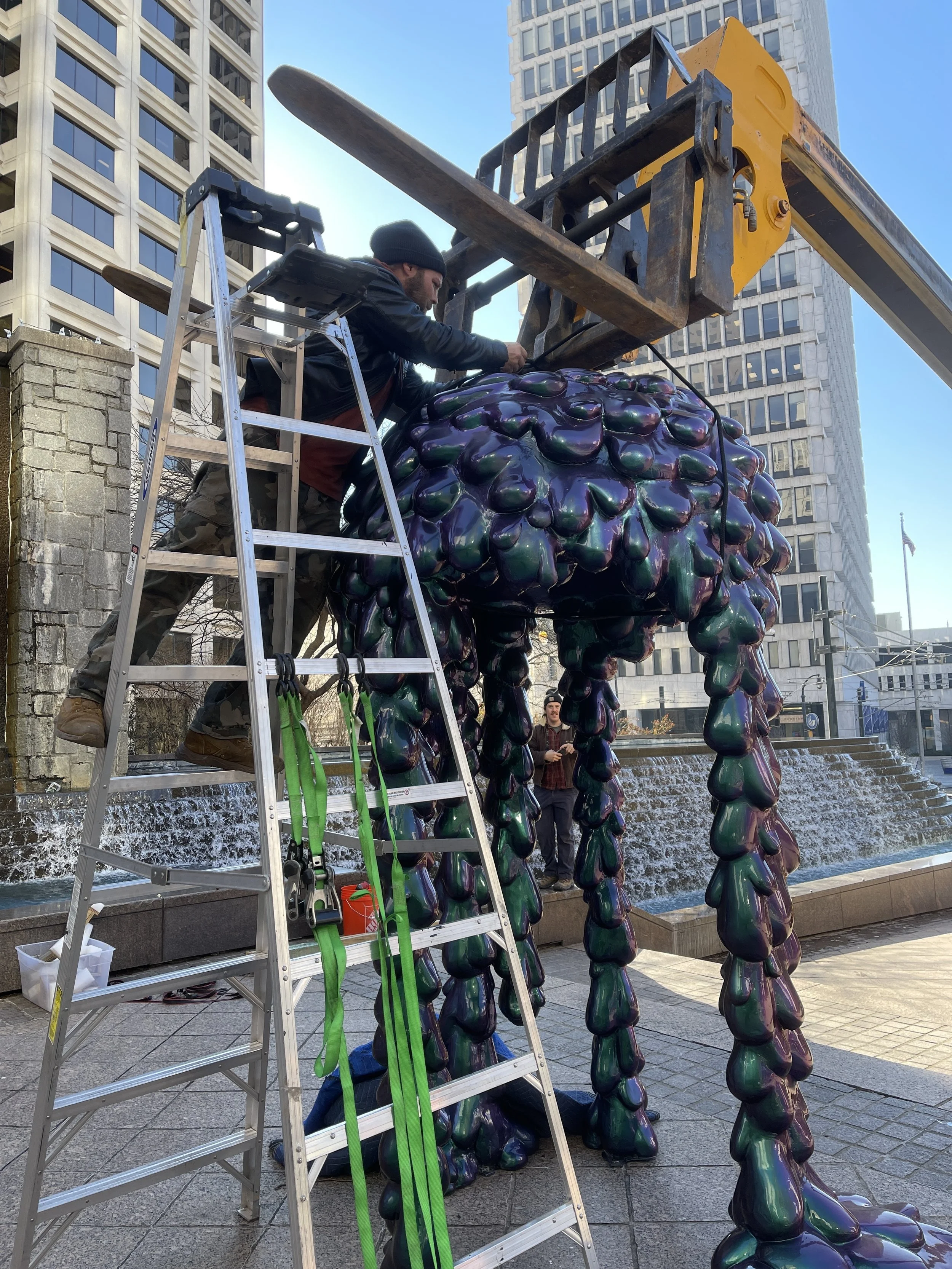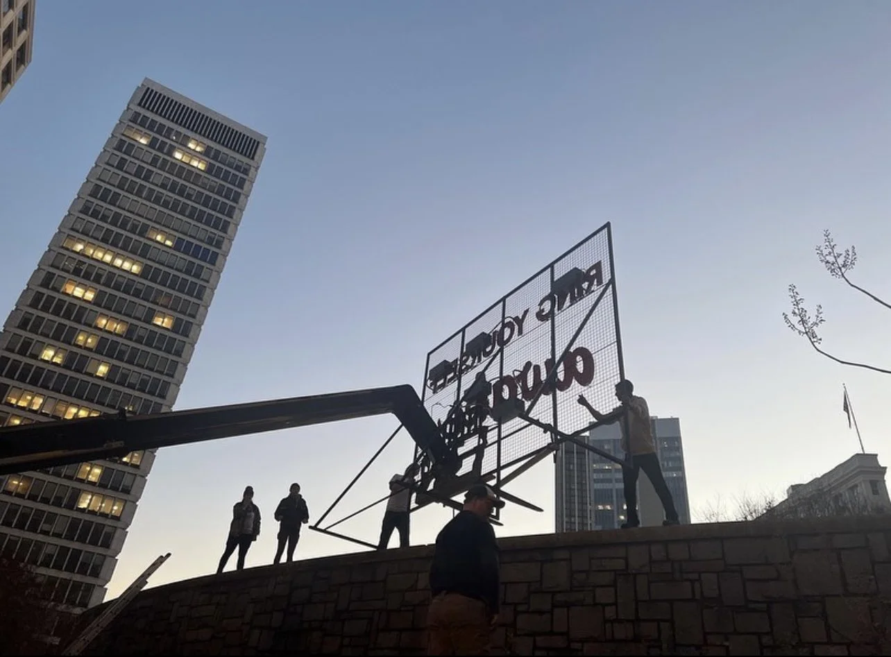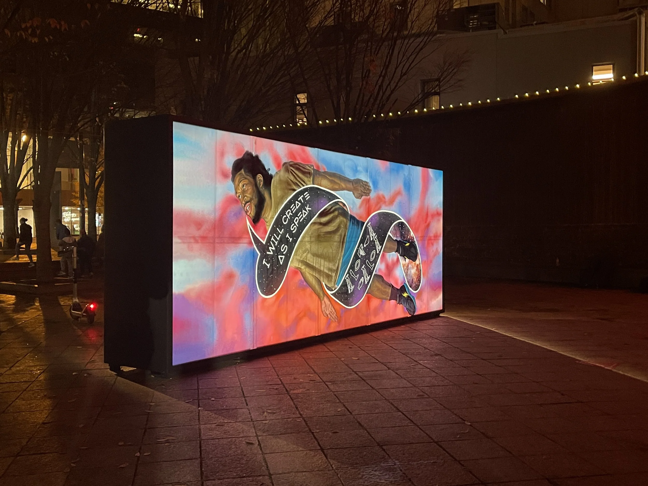 A 20ft acrylic lightbox fabricated for artist Fabian Williams. 14ft x 12ft metal armature installed and mounted on top of the Woodruff Park Fountain. Neon provided by Element 10. A Subtle Alchemy, by artist Dan Lam, restored and installed in front of the Fountain. Featured in PRISM: Winter Lights curated by Dashboard.